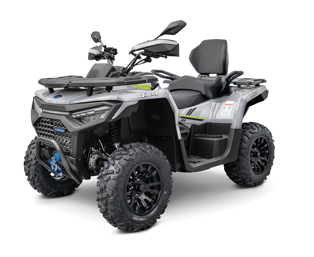 | 3000 lbs electric winch with synthetic rope, electronic power steering (EPS), fully adjustable shock absorbers with piggyback reservoirs, homologated towing hitch, 14" stylish aluminum rims, premium 26" Bulldog tires, composite front and rear racks, handguards, full LED lighting, large 7" TFT display, dual-tone stitched passenger seat with backrest, 12V socket, USB port. |