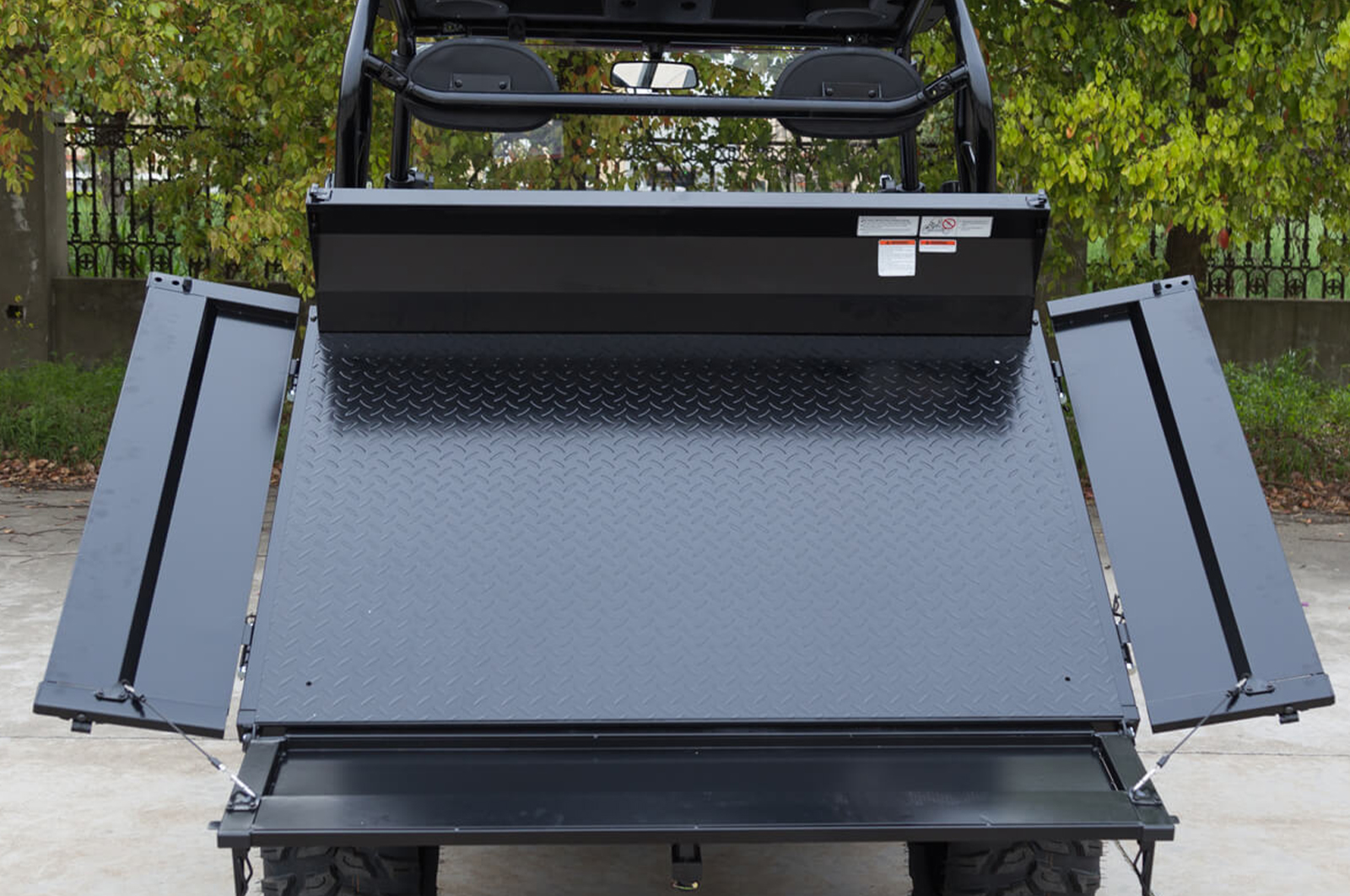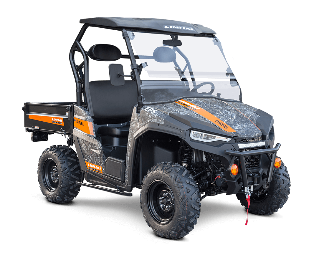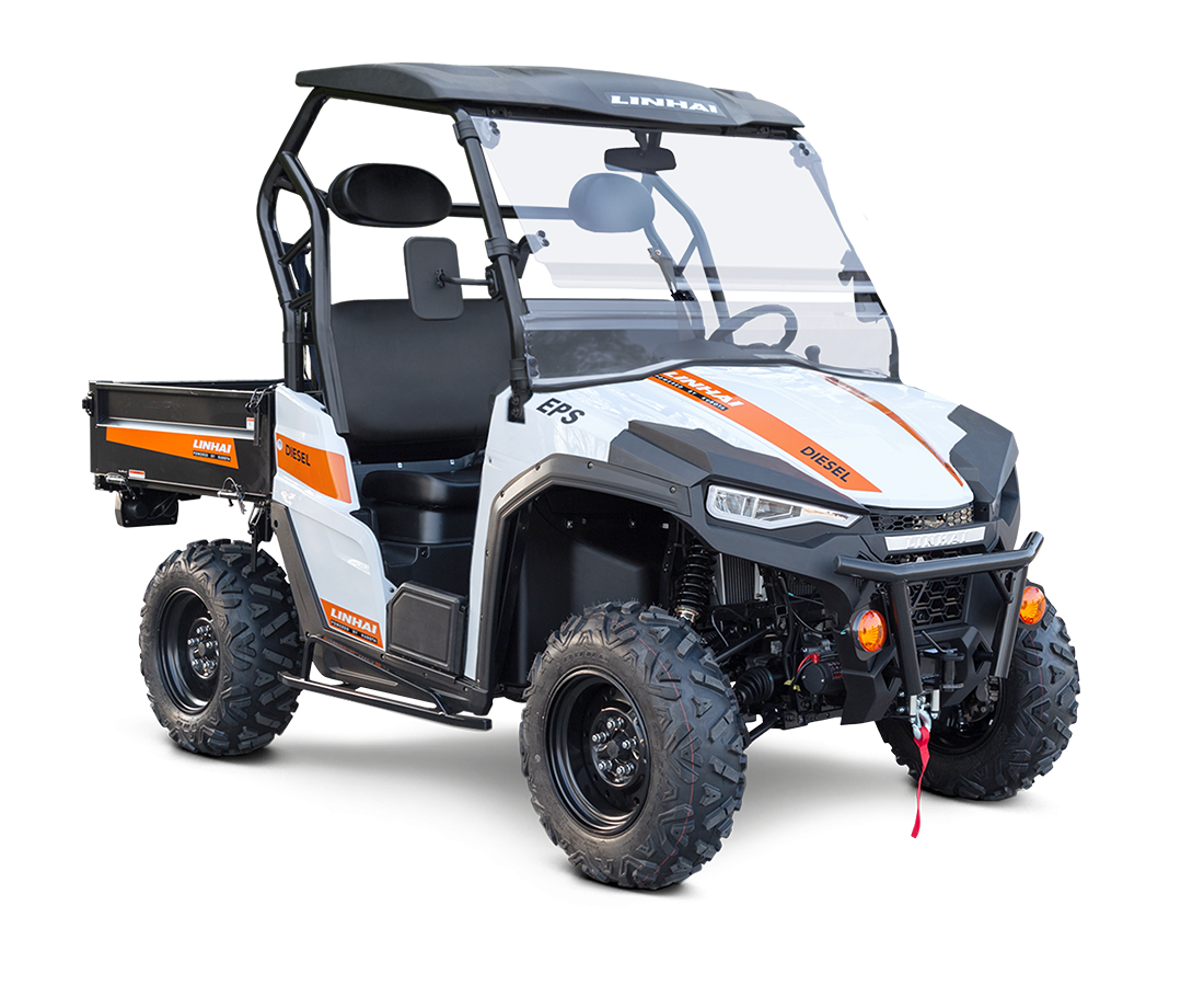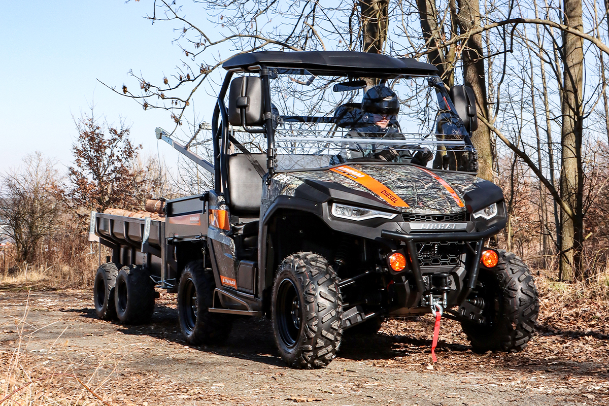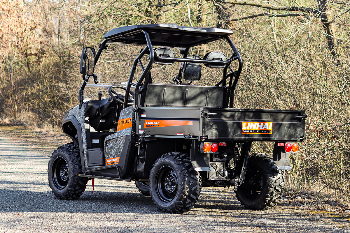 | Electronic power steering, extra-strong 4500 lbs winch, front bumper, steel side protection bars, 14" wheels with 6-ply tires, UV-resistant plastic roof, foldable foot guards integrated into the doors, ROPS safety frame, towing equipment: front tow hook and pin, rear homologated ISO 50 tow ball + pin adapter (included), three-person bench seat with safety belts, height-adjustable steering wheel, storage compartment in the dashboard, dual LED headlights with DRL, and acoustic reverse warning signal. |